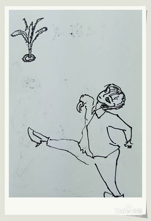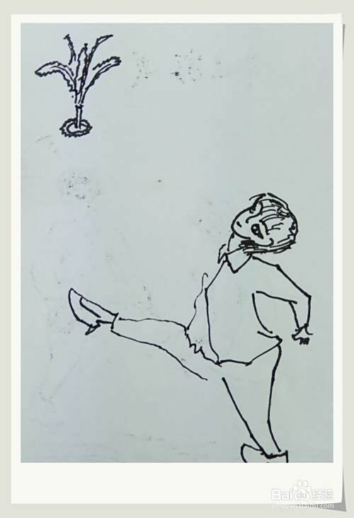 再用曲线画出踢毽子人的另外一个胳膊,你看他的姿势,正踢得起劲。