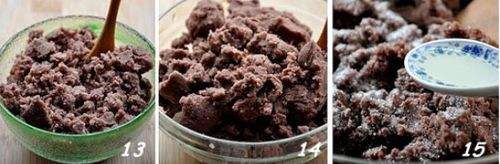 13、14、拧干水分的豆沙。图13是手工的,图14是搅拌机打碎的。后一种因为混合了红豆的皮,所以颜色稍深一些。但口感差别不大。