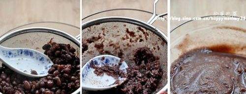 8、9、经过勺子反复地按压,筛网中最后只剩下豆子的皮,豆沙则沉入碗中。豆子皮倒掉不用。