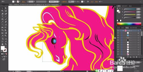 用网格工具做出蓝色的渐变的眼晴,再用咖啡色与白色分别填充眼白与瞳孔,再用半透明的白色填充眼晴的高光区域。马儿头上的鬃毛用暗粉红色填充。