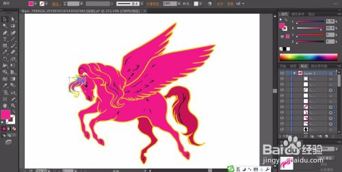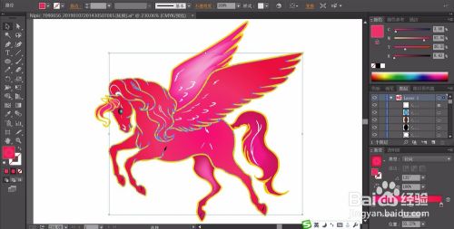 马儿身上的线条用白色填充,再用网格工具给马儿的尾巴、左边的翅膀、后肢做出红色的渐变效果,再让马儿的其它区域呈现出一个粉红色的渐变效果。