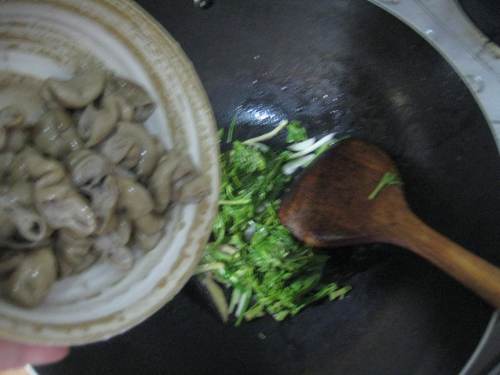 7放入香椿和肥肠炒散炒匀,加入一些作料 ,就可以出锅了!