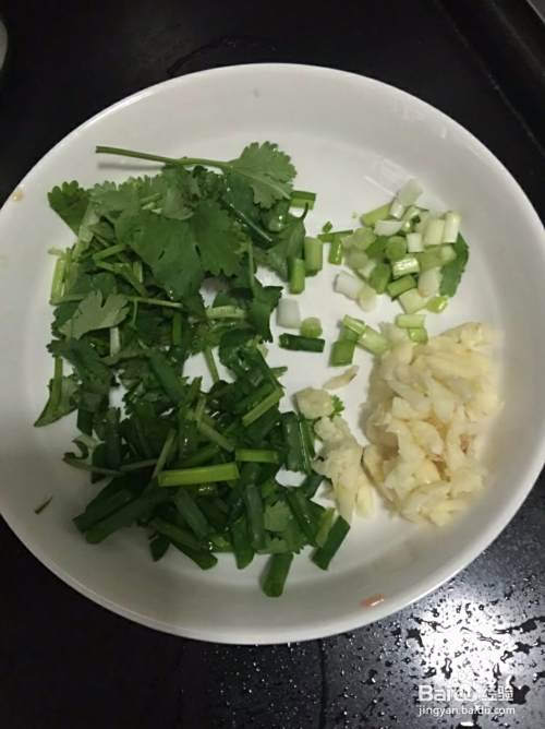 准备好蒜蓉、香菜末和葱末 准备待用。