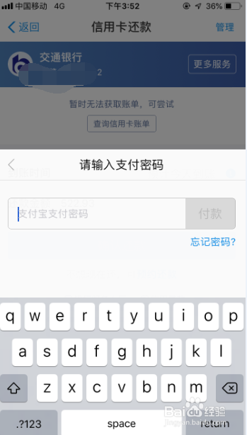 然后重新回到支付宝的交通信用卡还款,输入还款金额。再确认付款,选择付款方式,选余额宝,前提是你的余额宝里面有足够的钱还信用卡。