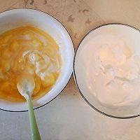 往蛋黄液中加打发好了的蛋清,分三次加入,上下搅拌,不要搅拌过快,搅拌过快会使蛋清的发性降低