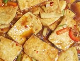 倒入煎好的豆腐小火焖煮,加盐、白糖调味,并翻动让汤汁煮进每块豆腐