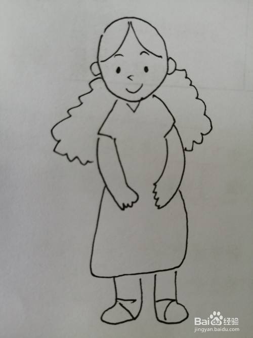 第七步,最后把漂亮的妈妈的两只腿画出来。简笔画漂亮的妈妈就画好了。
