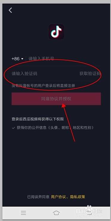 输入抖音帐号的电话号,获得验证码,点击同意协议并提交即可。