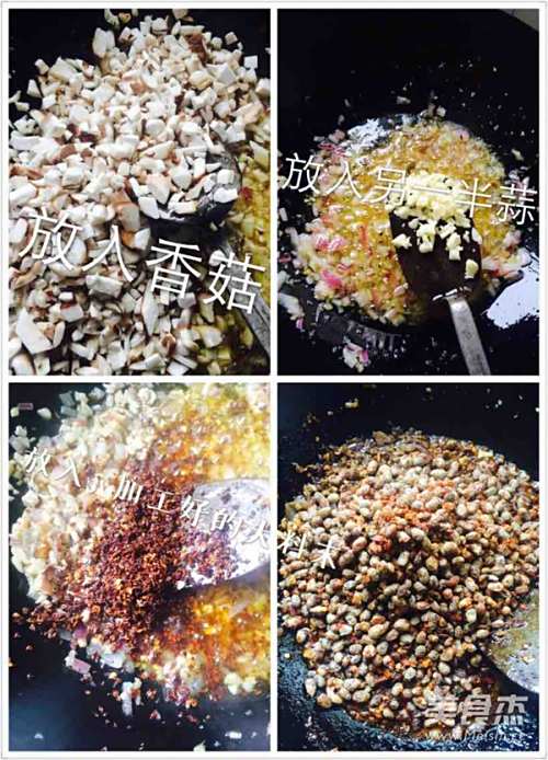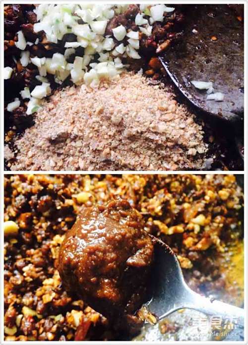 7倒入花生芝麻末,和一勺子黄豆酱!和最后的蒜末!翻炒至END