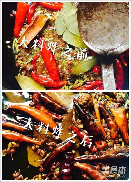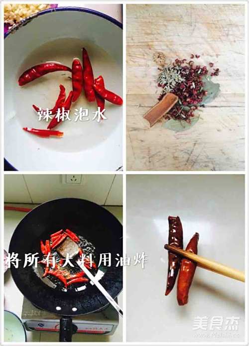 1辣椒泡水后,不会太辣,会香!辣椒炸至如图!其他调料炸出香味取出备用!