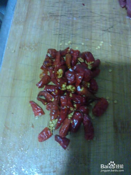 3. 干红椒切成段,备用;