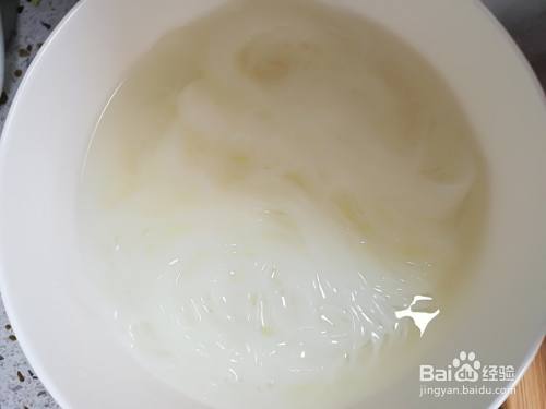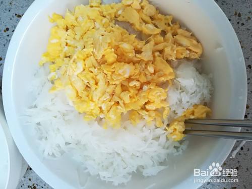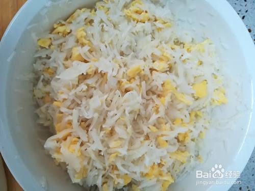 将白萝卜丝济水,和切好的粉条、葱放入大碗中。倒入做好的鸡蛋碎。加入适量香油、盐、味精,用筷子搅拌均匀。