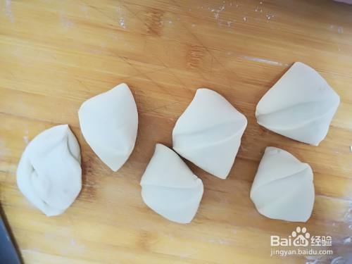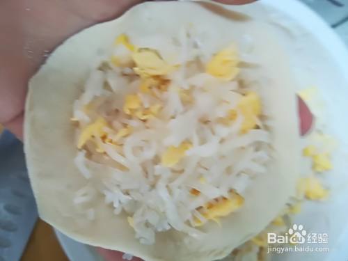 发酵好的面团做成一个一个小剂子,擀成面皮,将萝卜粉条馅放入面皮中包起来。