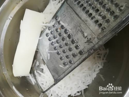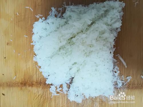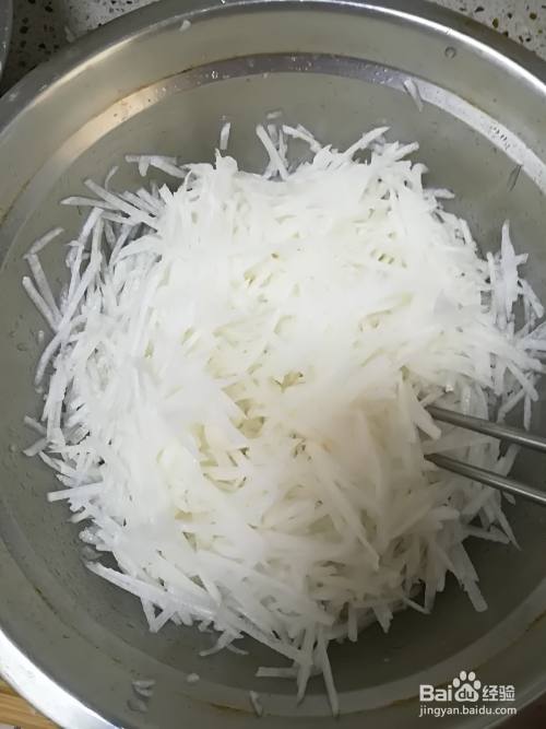 萝卜洗净切成长条状,用工具做成丝状。加入一勺盐,搅拌均匀放置十分钟左右。