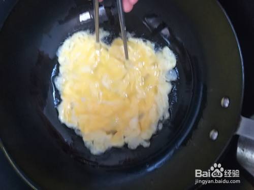鸡蛋在碗中搅拌均匀,锅中放油,油可以多些,油温稍微有点热后倒入鸡蛋液快速搅拌成碎末状。