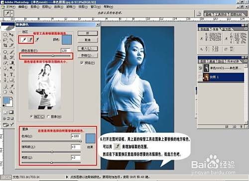 打开替换颜色对话框后,用上面的吸管工具在图像上要替换的地方吸色,然后在下面的替换区里选择你想要的衣服颜色,我选蓝色吧。