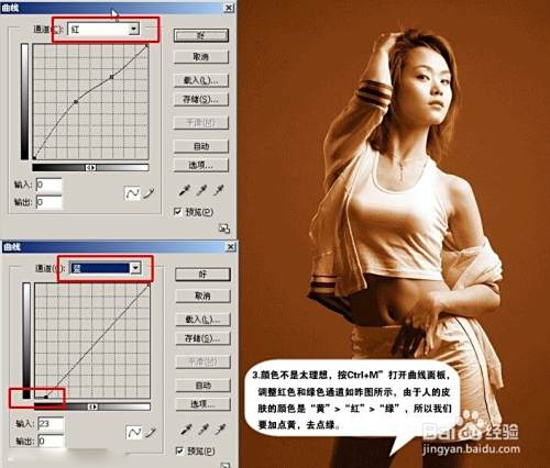 颜色不是太理想,按CTRL+M打开曲线面板,调整红色和蓝色通道。由于人的皮肤颜色是“黄”>“红”>“绿”,所以我们要加点黄,去点绿。
