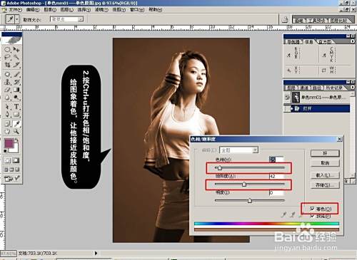 按CTRL+U打开色相/饱和度,给图像着色,让他接近皮肤颜色。