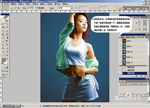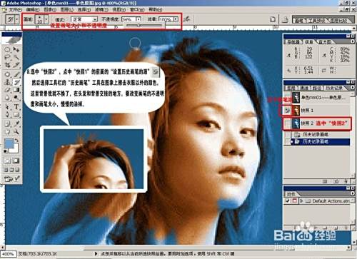 选中快照2,点击快照1的前面的“设置历史画笔的源”,然后选择工具栏的历史画笔工具在图像上擦去衣服以外的颜色。这里背景我就不换了,在头发和背景交接的地方,要改变画笔的不透明度和画笔大小,慢慢的涂掉。