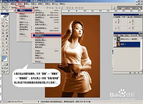 我们先从衣服开始着色,打开图像-调整-替换颜色,也可以用上一步的色相/饱和度来上色(这个有点缺陷是白色的地方是上不上色的)。
