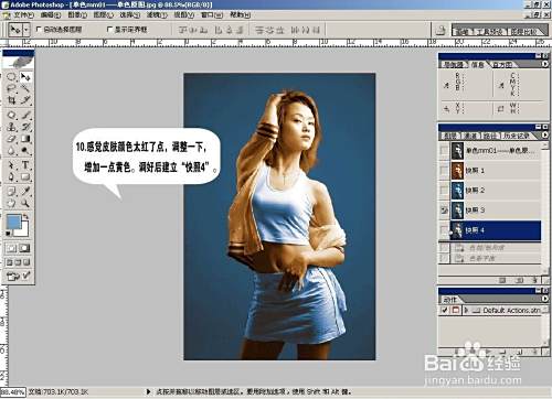 感觉皮肤颜色太红了点,调整一下,增加一点黄色。调整后建立“快照4”。