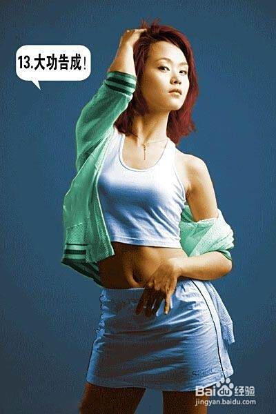 同样的方法,头发颜色我们把它换成红色的,下面一些细节再处理一下,眼睛部位降低饱和度让眼睛更黑些,嘴唇加红一点,下面短裤反光强一点,和背景分开。