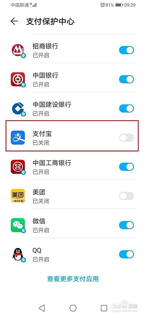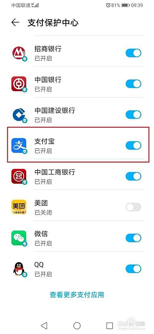 5、第五步找到支付宝之后,点击开启支付宝,就开启支付宝支付保护了,根据需要使用