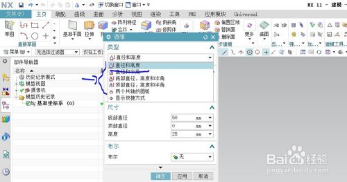 UG提供了多种构建圆锥方式,选择一种构建圆锥的方式,然后设置对应参数。