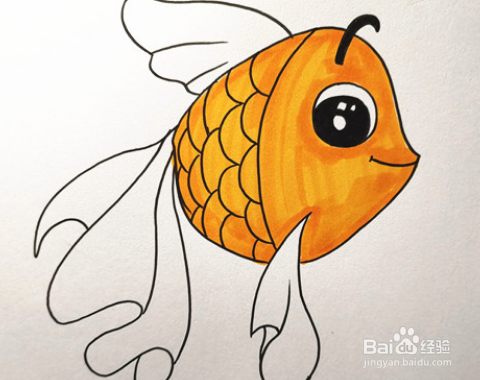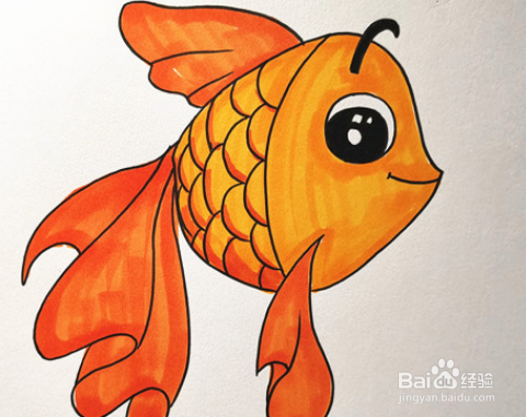 最后,用橘色深涂金鱼的尾巴和鱼鳍,这样一幅画就完成了。