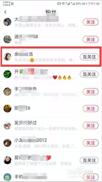 打开粉丝的界面中,找到一个互相关注的人,互相关注就是你关注了她,她关注了你,就是好友
