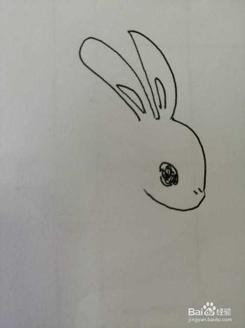 第三步,接着在可爱的小兔子的头部里面画出一只黑色的大眼睛,小兔子眼睛很漂亮。