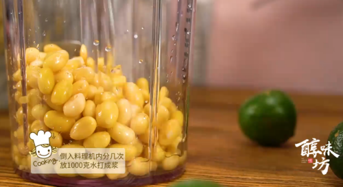 黄豆泡发后沥干,分几次倒入料理机内,加1000克水打成浆。