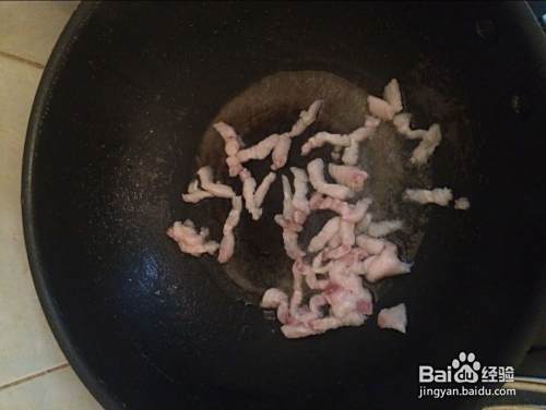 用炸土豆条剩余的油(只需一点点)炒肉,肉炒到变色的时候加一点酱油,翻炒几下。