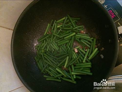 然后把蒜台倒入锅中,要不断的翻炒,避免炒糊,炒到蒜台外表变皱变软。