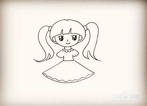 下面画小女孩身上穿着的裙子,先把裙子的上半部分给勾勒出来,再画出裙摆,裙子的裙摆非常的大,要画得长一些。