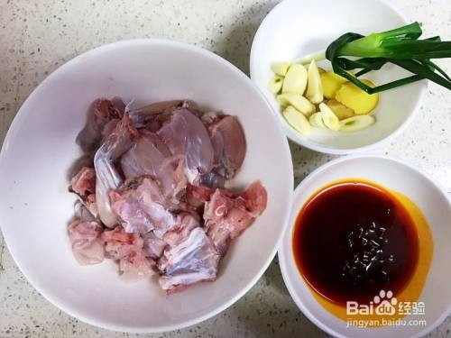 将牛蛙剁成小块,把配料准备好。牛蛙里放入料酒、淀粉腌制10分钟左右。