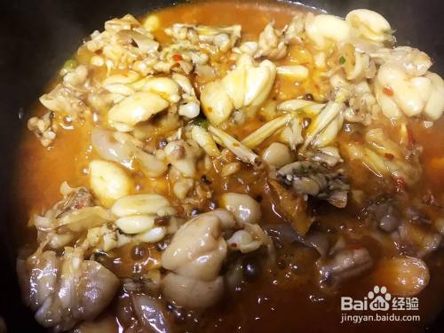 锅里放油烧热,放入花椒、大蒜和生姜爆香,加入豆瓣酱,加入牛蛙翻炒均匀,加水没过牛蛙,大火收汁即可。