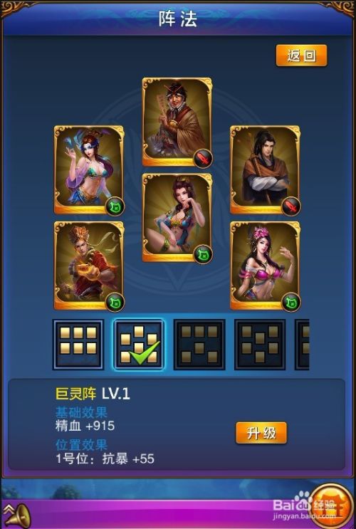 巨灵阵:全队增益生命,一号位增益抗暴,可升级。
