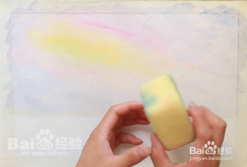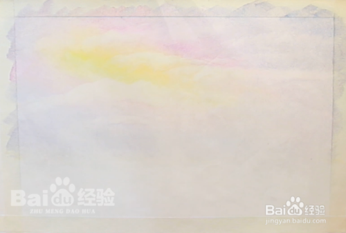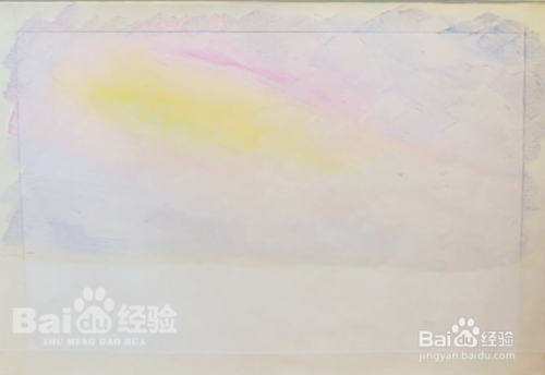 颜料:青莲+锌钛白,同上一步的步骤,将颜色调和后上在第三层颜色上面,为天空铺上第四层颜色。如下图所示: