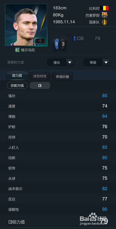 维尔马伦(欧洲/美洲杯赛季):维尔马伦给人的感觉是一直都在受伤,本来在阿森纳表现很不错,但是到了巴塞罗那一直在受伤,游戏中维尔马伦作为替补中后卫还是很不错的,除了身高只有183外,其他方面还是很不错的。