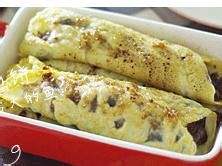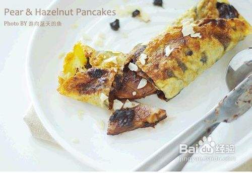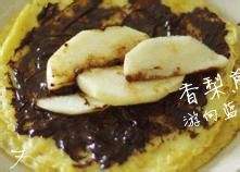 将巧克力涂抹在鸡蛋饼上,然后放上几片梨片。