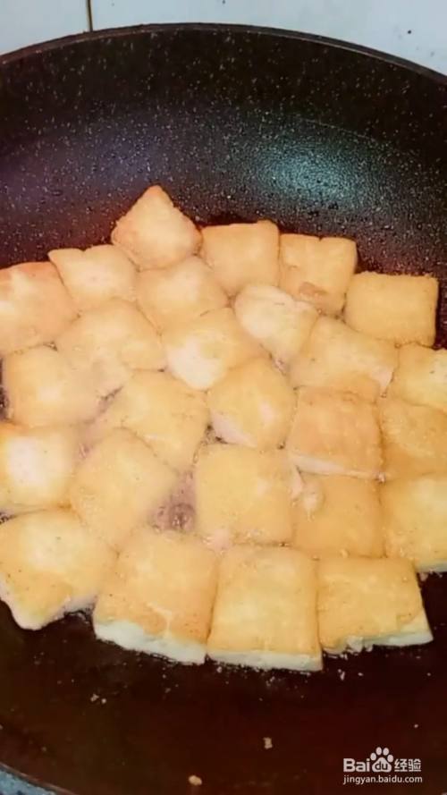 豆腐切成小块,锅中烧油,将豆腐放进去煎至表面金黄,捞出控油备用。