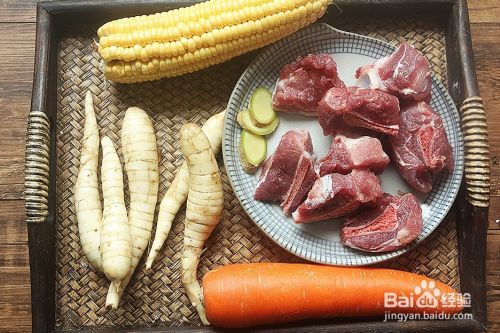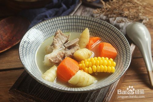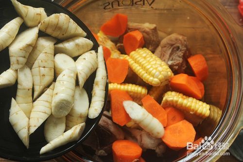 将处理好码蕉的猪骨、胡萝卜、玉米和竹薯放进汤锅怕颂侮里;