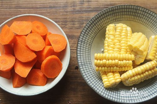胡萝吩鉴卜去皮切块,玉米切成段后再竖切成条状;