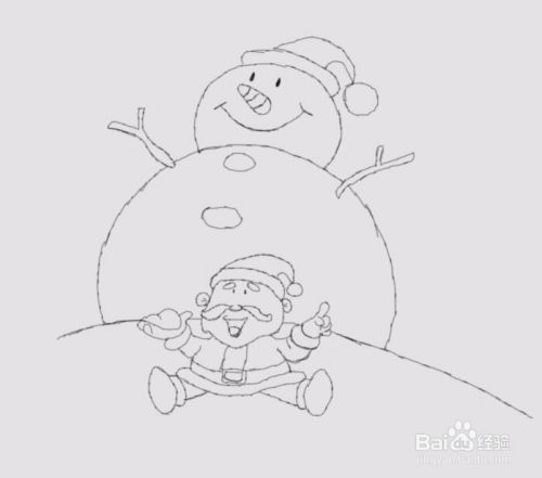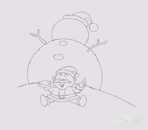 在圣诞老人的后面画出地面,然后在地面上画出雪人的身体及身体上的装饰物,如图所示: