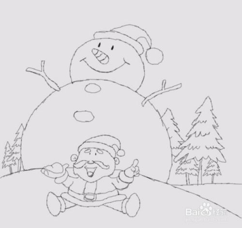 最后我们在雪人的身后再画出圣诞树,这样圣诞老人雪人圣诞树我们就画好了,如图所示: