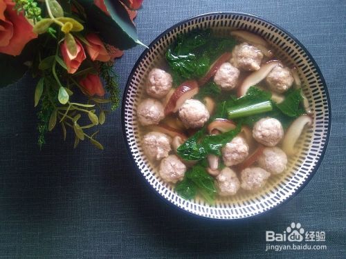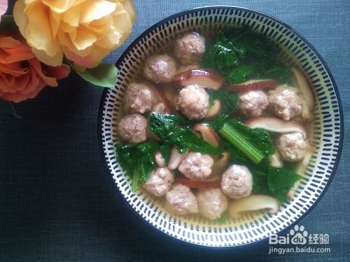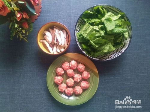 1、小白菜切片,香菇切丝,猪肉馅加水淀粉生抽盐调匀搓成球状。