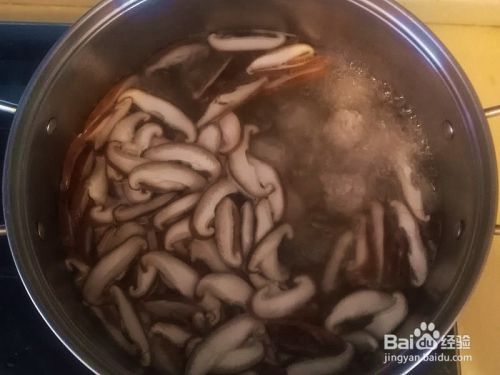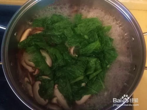 5、下入香菇后待水再沸,放入菜叶滚开后,加盐生抽调味关火。