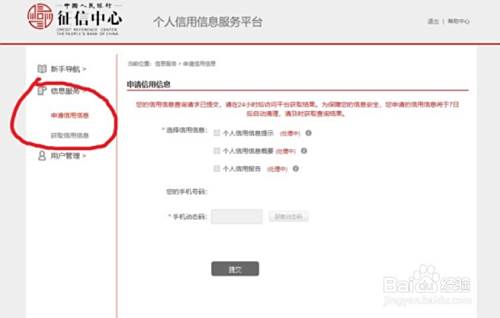 5、在网页右侧,点击“信息服务”-“申请信用信息”,按照提示验证后即可查询信用