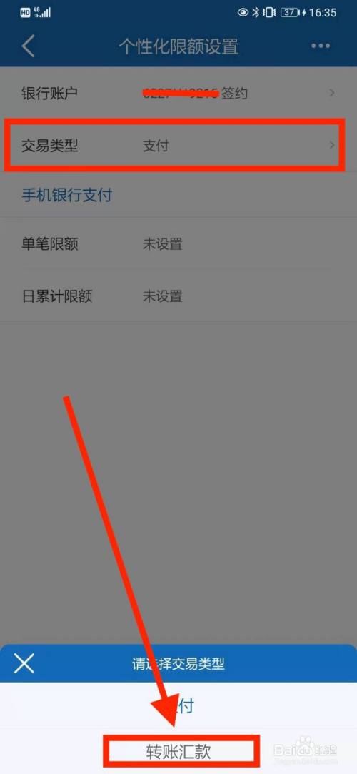 在打开的个性化限额设置页面,打开【交易类别】选择窗并选择【转账汇款】选项,如下图所示。